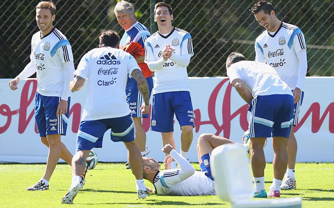 北京时间6月13日,阿根廷队训练备战,众将心情轻松,训练中,队友摔倒引梅西大笑。