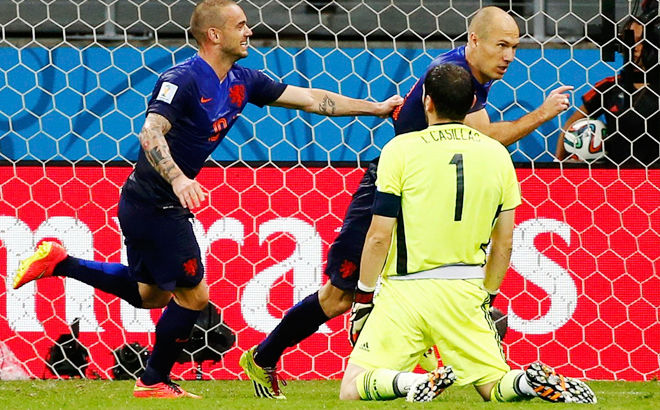 6月14日凌晨,西班牙队迎战荷兰队,荷兰5-1逆转获胜。范佩西罗本梅开二度,德弗里头球破门。