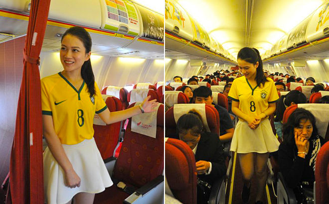 中国云南某航空公司航班上,空姐穿着巴西队服为旅客服务。